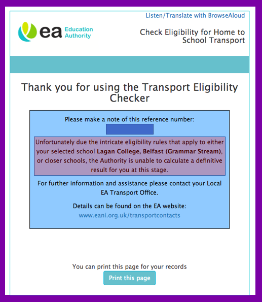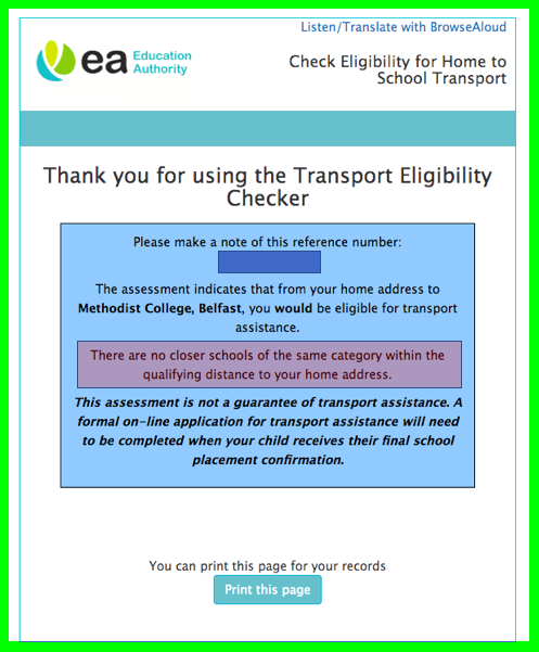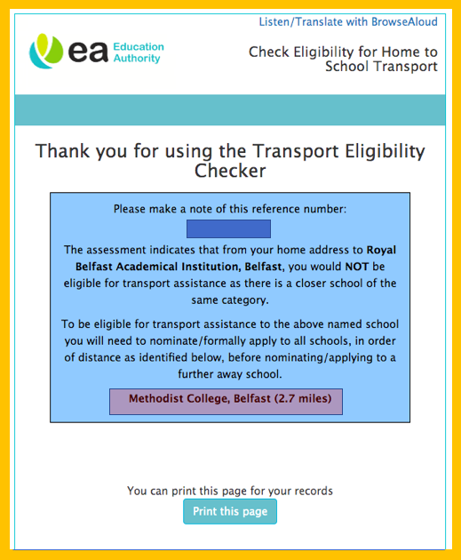 See example in the orange picture above – in this example, an application was being made for travel assistance to RBAI and the result basically suggests that ‘if the child had applied to Methody but their application was not accepted’, then yes, they would be eligible for assistance from home.