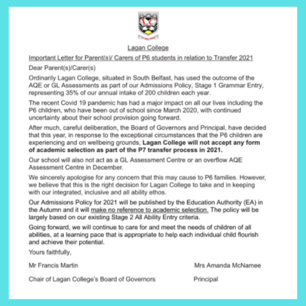 In the letter from Lagan College (31st May 2020) they explained that the decision to remove AQE/GL as part of the admission criteria was made after careful deliberation with the Board Of Governors and Principal and they sincerely apologised for any concern this may cause P6 families.
