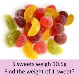 To work out the weight of one sweet you need to divide 10.5g by 5.