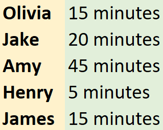 Miss Hawthorne takes a survey to find out how long the children spend on their homework.
